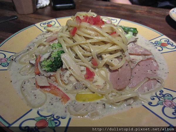 這次我和朋友點了沙嗲風味雞肉披薩、歐陸什錦香腸義大利麵(加附餐)、香料炸脆薯